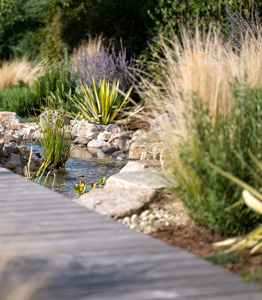 Der prämierte Vorgarten vereint mediterranes Flair mit naturnaher Gestaltung: eine Natursteinmauer mit Bachlauf, ein Holzdeck als Rückzugsort sowie ein kleiner Obst- und Gemüsegarten. Die Bepflanzung, inspiriert von Mallorca, schafft eine harmonische Verbindung aus üppigen Stauden, Olivenbäumen und Zedern.