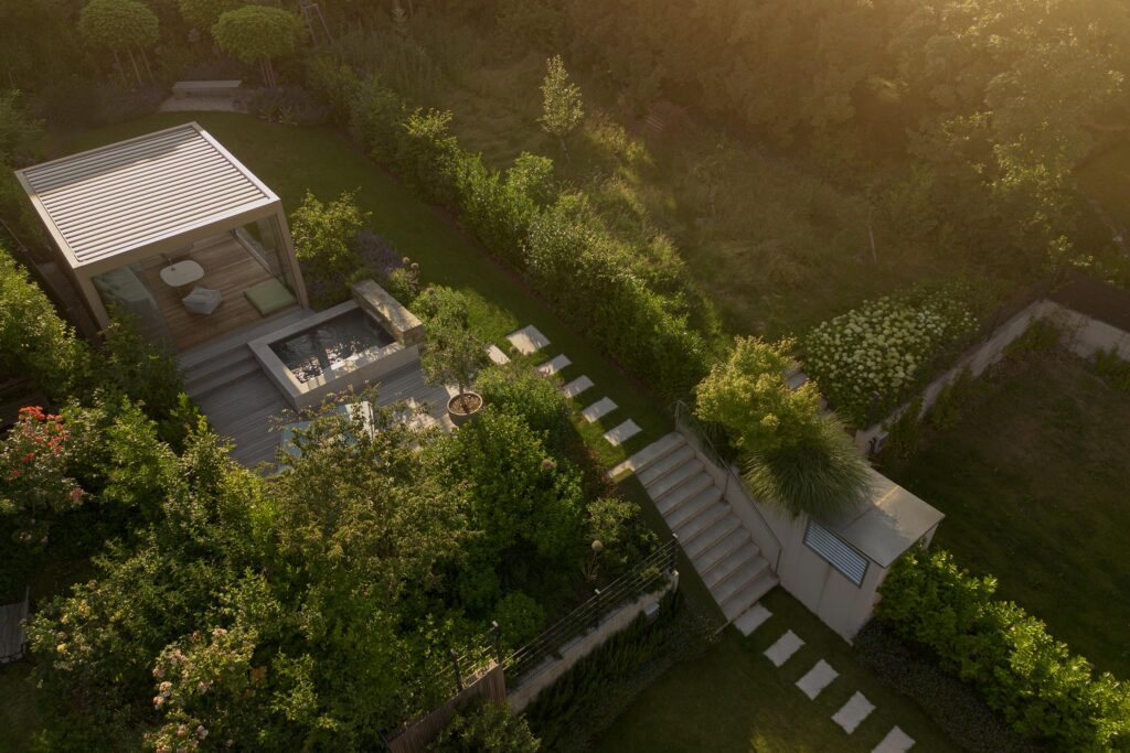 der alle fasziniert. Diesen Garten gibt es nun – er umgibt den umweltfreundlichen Bürokubus der Begründer. Bildet damit eine natürliche Einheit, zeigt wie harmonisch Innen und außen, Arbeit und Entspannung ineinander übergehen. Besonders bezaubernd strahlt dieses Kleinod in den Abendstunden dank eines ausgeklügelten Beleuchtungskonzepts.