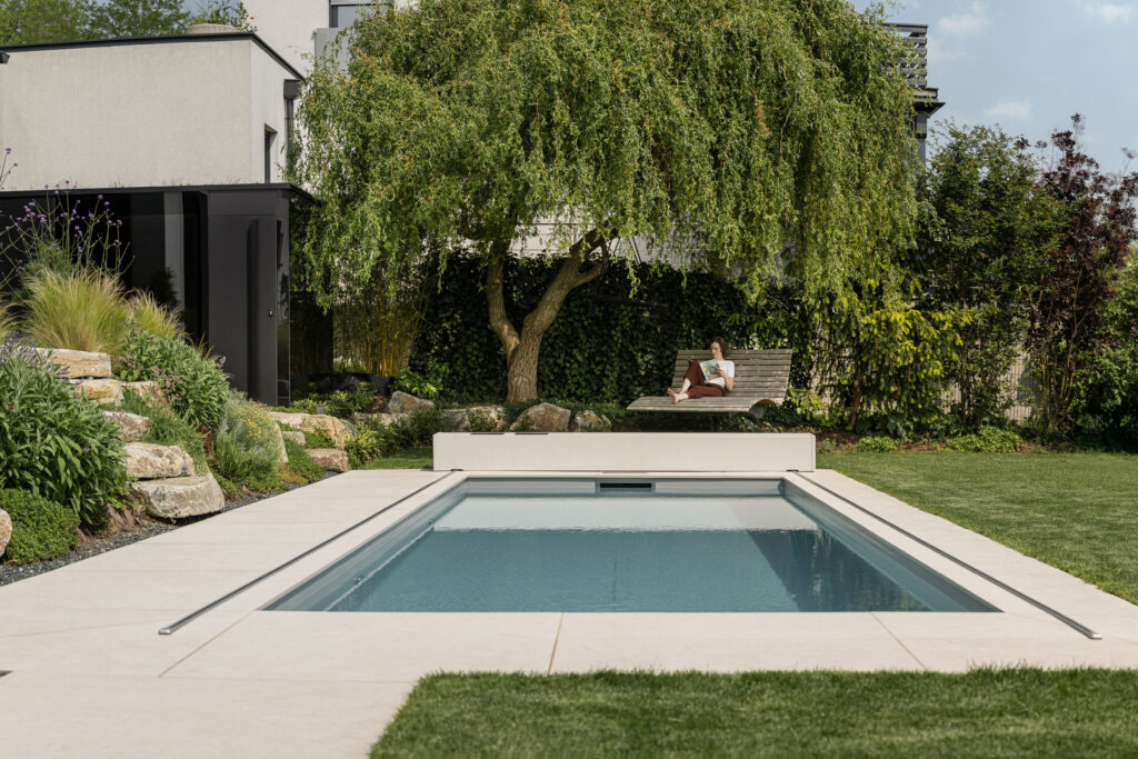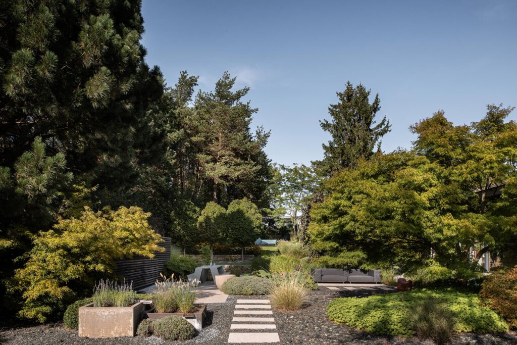der alle fasziniert. Diesen Garten gibt es nun – er umgibt den umweltfreundlichen Bürokubus der Begründer. Bildet damit eine natürliche Einheit, zeigt wie harmonisch Innen und außen, Arbeit und Entspannung ineinander übergehen. Besonders bezaubernd strahlt dieses Kleinod in den Abendstunden dank eines ausgeklügelten Beleuchtungskonzepts.